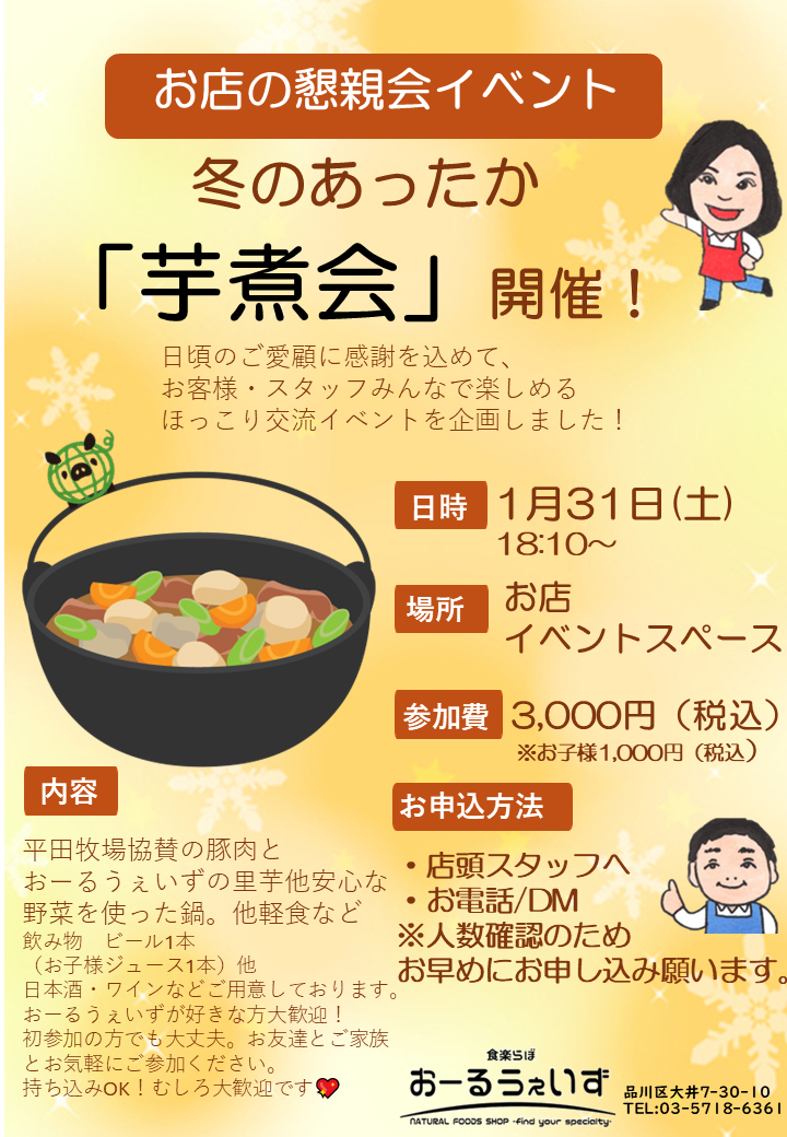 平田牧場協賛の豚肉と、おーるうぇいず厳選の安心野菜・里芋を使った芋煮鍋をご用意。
